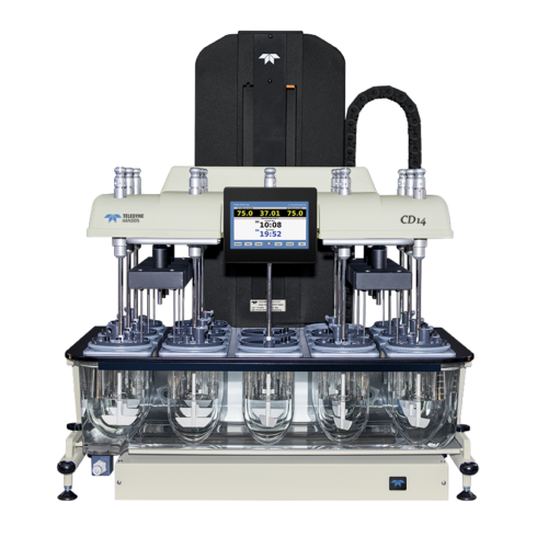 The Teledyne LABS 14-vessel CD14 Comparative Dissolution Tester runs two methods simultaneously or independently—ideal for bioequivalence studies of generic vs. innovator drug formulations. The 14 stirring positions allow for 6+1 or 12+2 configurations for improved workload efficiency in R&D, formulations, QC, and stability-test labs. With digital temperature probes at 12 positions the CD14 comparative dissolution tester is able to test two different formulations with separate settings for every parameter under the same temperature conditions. Efficiency and Productivity -Smallest footprint in its class: 85 cm W x 61 cm D. -Precision vessel centering system exceeds the most demanding enhanced mechanical specifications. -Store up to 500 protocols (methods) on-board. -Rugged waterbath with low-position front port for ease of draining. -Large color touch screen with adjustable tilt angle for operators of different heights. -Compatible with Apparatus 1, 2, 5, and 6. -Seamless integration with CD AutoPlus™ autosamplers and AutoFill™ fraction collectors.