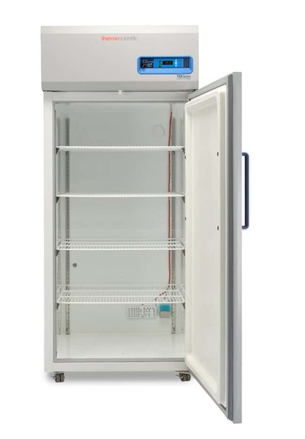 Thermo ScientificTM TSX Series high-performance -20°C manual defrost freezers are designed are designed for applications in which even slight intermittent coil warming during auto defrost cannot be tolerated. The design supports sample protection and sustainability objectives for the storage of enzymes, reagents, pharmaceuticals, vaccines, biological and other commonly used laboratory and clinical materials. The Series’ V-drive technology is designed to provide temperature uniformity that continually adapts to user patterns, offering significant energy savings without compromising protection. The TSX Series delivers the performance and quality you need, in addition to the low sound, low energy, and exceptional user experience you deserve. Features and Benefits The drive for sample integrity and security ▪ Designed to safely store enzymes, reagents, pharmaceuticals, vaccines, biological and other commonly used laboratory and clinical materials requiring a tight temperature performance ▪ Unique V-drive technology is designed to detect usage patterns such as door openings when a higher compressor speed is needed and periods of stability where the compressor runs at a lower speed, saving energy without compromising protection ▪ Cold wall convection cooling for uniform and stable temperatures ▪ Easy to use microprocessor control with interior light, setpoint security and alarms ▪ Standard door locks provide comfort and assurance Enabling compliance ▪ Tested to GMP Clean Room Class A / ISO 5 & 6 (ISO EN 14644-1) with easy to clean surfaces support USP <797> and <800> hazardous drug compounding and other clean room environments ▪ Tested and certified to conform with the design and safety standards of UL 471, 61010, and CE Directive 2011/65/EU and 2015/863 Designed for an ergonomic and comfortable experience ▪ Ergonomically designed door handle with a soft-touch grip ▪ The controller is angled to help prevent neck strain ▪ Automatic pressure equalization port the enables fast reentry ▪ Easy to clean and adjust epoxy coated shelves ▪ Whisper quiet with a sound level of 52 dBA, enabling end users to work alongside the refrigerator without distraction ▪ Self-closing door with 90° stop to assist with inventory loads Verified sustainability ▪ US EPA ENERGY STAR Certified with up to 50% less energy usage than conventional refrigerant models* ▪ ACT Environmental Impact Factor Label Certified, providing third-party verification of the sustainable impacts of the product, its operations, and its end of life. ▪ Natural, R290 refrigerants and water-blown foam make the TSX Series compliant with EU F-GAS regulations, U.S. Environmental Protection Agency’s Significant New Alternatives Policy (SNAP), and other Global Environmental Regulations. ▪ Manufactured in an award-winning, zero-waste to landfill facility Ready for connectivity and monitoring ▪ Thermo ScientificTM DeviceLinkTM Connect ready, enabling you to have a connected experience with your unit so you always—and anywhere— know the safety of your samples and the performance of your refrigerator or freezer. ▪ Compatible with wireless monitoring systems and remote alarm contacts including our Thermo ScientificTM Smart-VueTM Pro wireless monitoring systems Make it your own ▪ Alternate Door swing configuration and door types ▪ Extra and Alternate wire baskets, shelves, and drawers ▪ Free-standing or factory-installed chart recorders ▪ E-Lock Adapter kits ▪ 4-20 milliamp transmitters and other remote alarm modules ▪ Specialty, regional, and country specific plugs Services and support ▪ Industry Leading 120-month compressor warranty (varies by country, please contact us for details) ▪ Optional Certificate of Calibration to an NIST (National Institute of Standards and Technology, formerly National Bureau of Standards) traceable instrument includes a model number and serial number certificate ▪ Optional Validation Testing Programs include in house and field-based temperature mapping and Installation Qualification (IQ) and Operation Qualification (OQ) programs ▪ Optional Factory Acceptance Test results including QC Test Log Sheets and QC Temperature Graphs